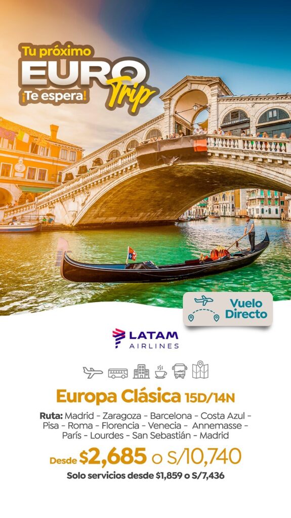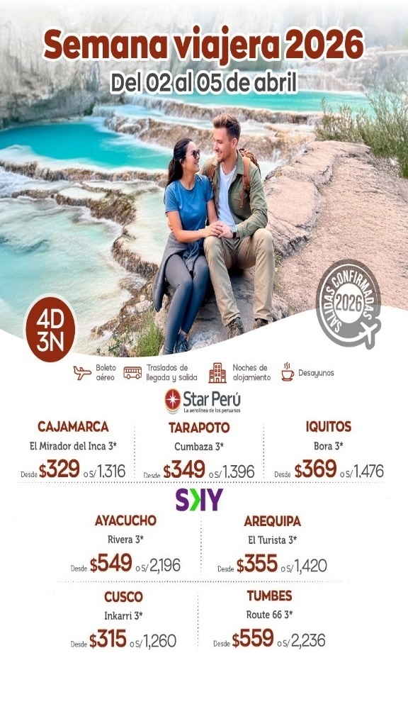Paquetes Turísticos Tu próximo viaje a Europa te espera!!! Desde $3465Este precio incluye boleto aéreoMás información Europa de ensueño!!! Desde $2685Este precio incluye boleto aéreoMás información Lugares maravillosos de Perú!!! Desde $315Este precio incluye boleto aéreoMás información Riviera Maya, un paraíso caribeño!!! Desde $935Este precio es sólo serviciosMás información Momentos inolvidables en Brasil!!! Desde $229Este precio es sólo serviciosMás información China Mágica !!! Desde $3609Este precio es sólo serviciosMás información ¿Porque elegirnos?Experiencia y profesionalismoAtención personalizadaDestinos exclusivos y únicosCalidad y confianzaOfertas y promocionesSoporte durante todo tu viaje Más de 5 años Reseñas comprobadas Respuestas rápidas Te guiamos en el proceso